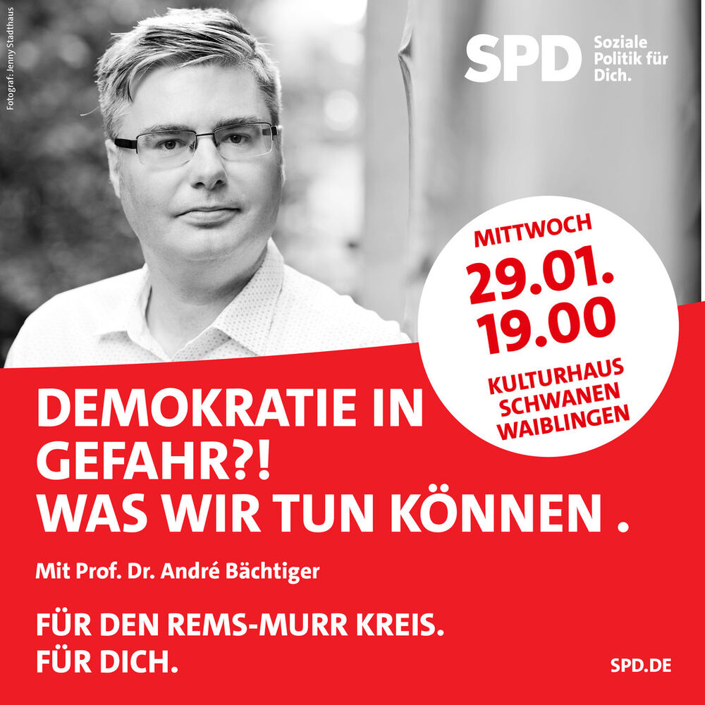 Wir laden herzlich zur Veranstaltung „Demokratie in Gefahr?! Was wir tun können“, die der OV Waiblingen gemeinsam mit den Jusos Rems-Murr ausrichtet. Immer wieder ist in den Medien zu hören, dass wir uns in einer „Krise der Demokratie“ befinden. Das Erstarken antidemokratischer Parteien und Bewegungen, aber auch eine Demokratiemüdigkeit prägen die kulturelle Debatte.