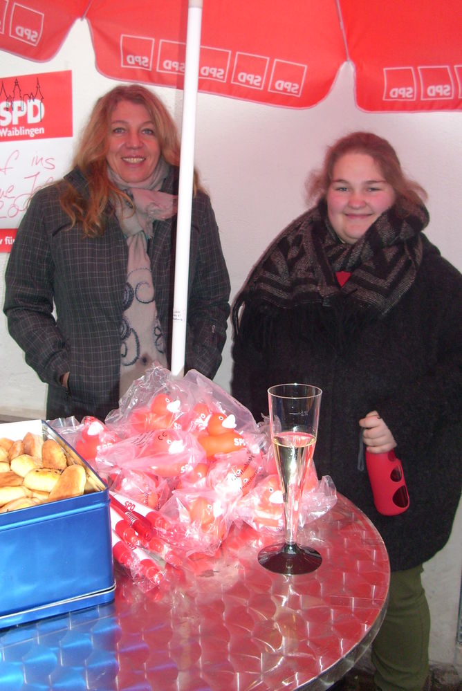 Bei Tee, Gebäck und Orangensaft gab es viele gute Gespräche zwischen Waiblinger Bürgerinnen und Bürgern und Mitgliedern der Waiblinger SPD. Wir freuen uns über diesen Dialog. Das Bild zeigt Bettina Süßmilch und Jula Hutzmann. Foto: Agnes Gabriel