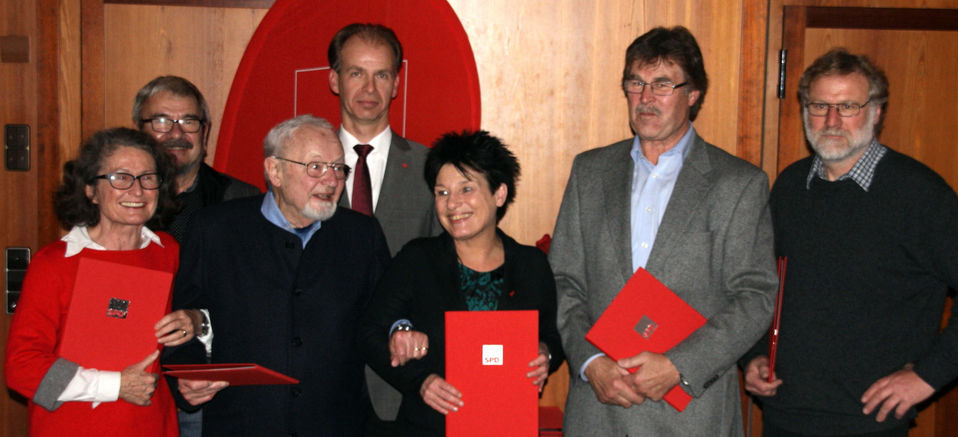 Die Jubilare der Waiblinger SPD im Jahr 2014Einige langjährige Mitglieder ehrte der SPD-Ortsverein Waiblingen auf einer festlichen Mitgliederversammlung am Samstag, 29. November, im Waiblinger Bürgerzentrum. Der Ortsvereinsvorsitzende Jörg Buchholz blickte auf die Jahre zurück, in denen die Geehrten in die SPD eingetreten sind. Die für 25 Jahre Mitgliedschaft geehrten Mitglieder sind im Jahr 1989 eingetreten. Dieses Jahr stand natürlich ganz im Zeichen des demokratischen Wandels in Osteuropa und Mauerfalls in Berlin. Buchholz erinnerte an die Worte Walter Mompers, dass „die Deutschen heute das glücklichste Volk der Welt“ sind und an die Worte Willy Brandts, dass „nun zusammenwächst, was zusammengehört.“ Er erinnert aber auch an Ereignisse, die mit den Ereignissen in Osteuropa nichts zu tun hatten, wie der 800. Geburtstag des Hamburger Hafens. 1989 sind Katrin Altpeter, Wilfried Keller, Gertrud Sielaff und Dr. Dierk Suhr der SPD beigetreten.